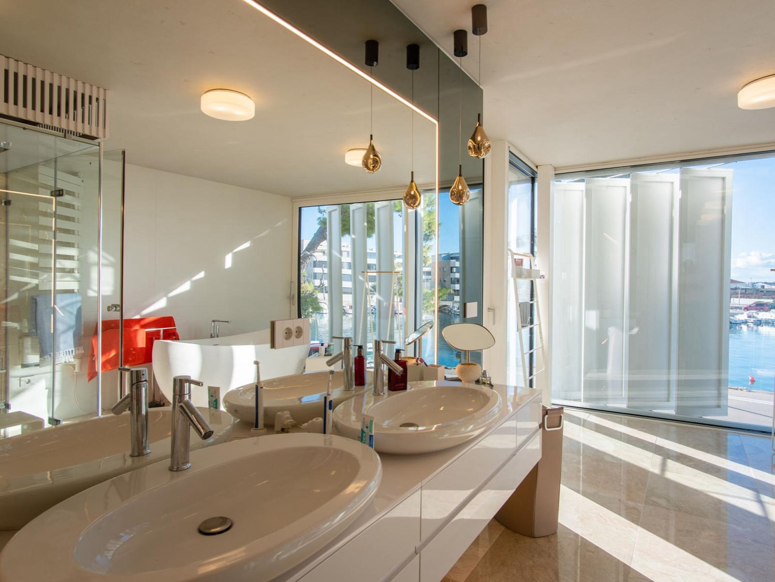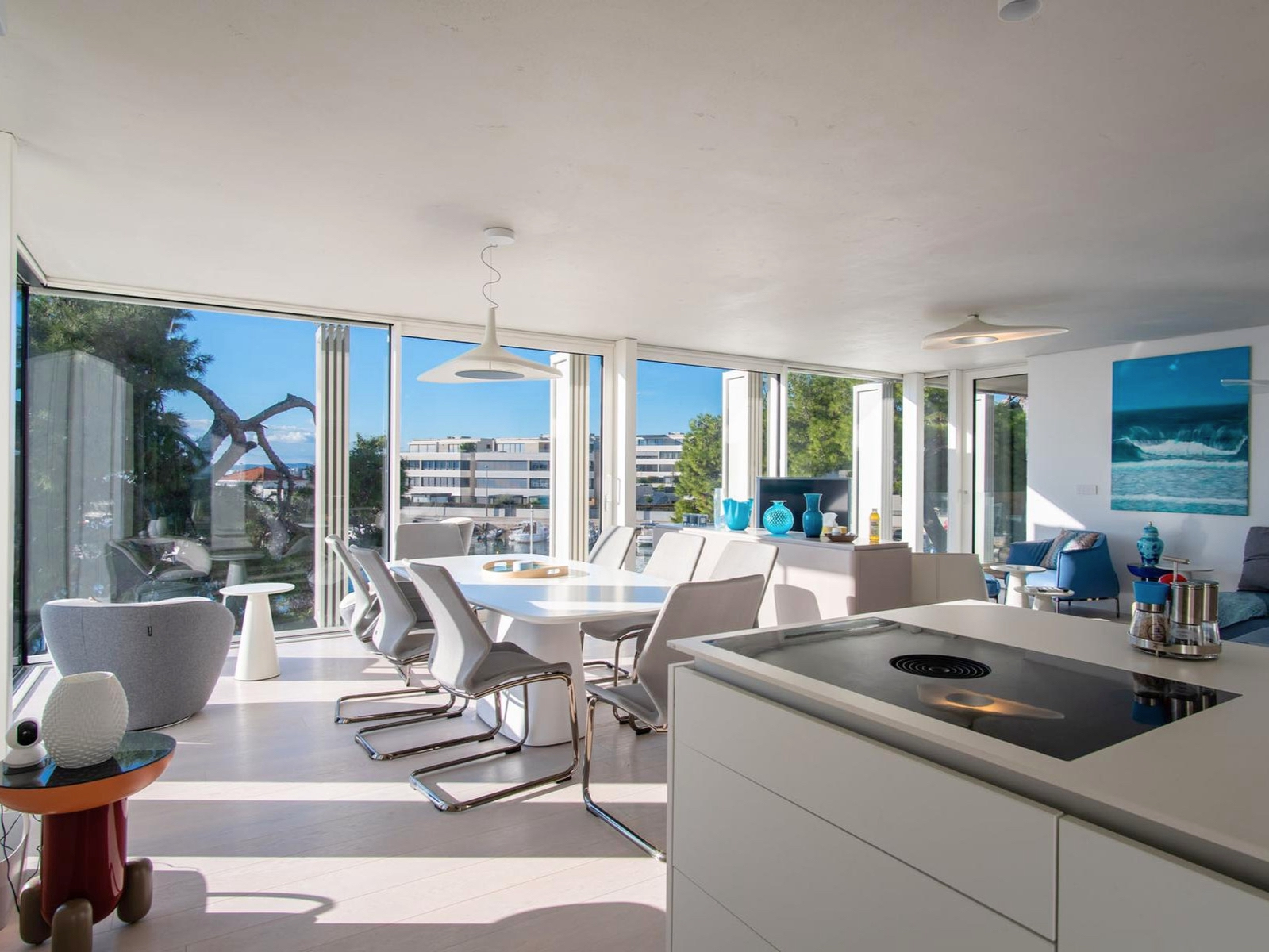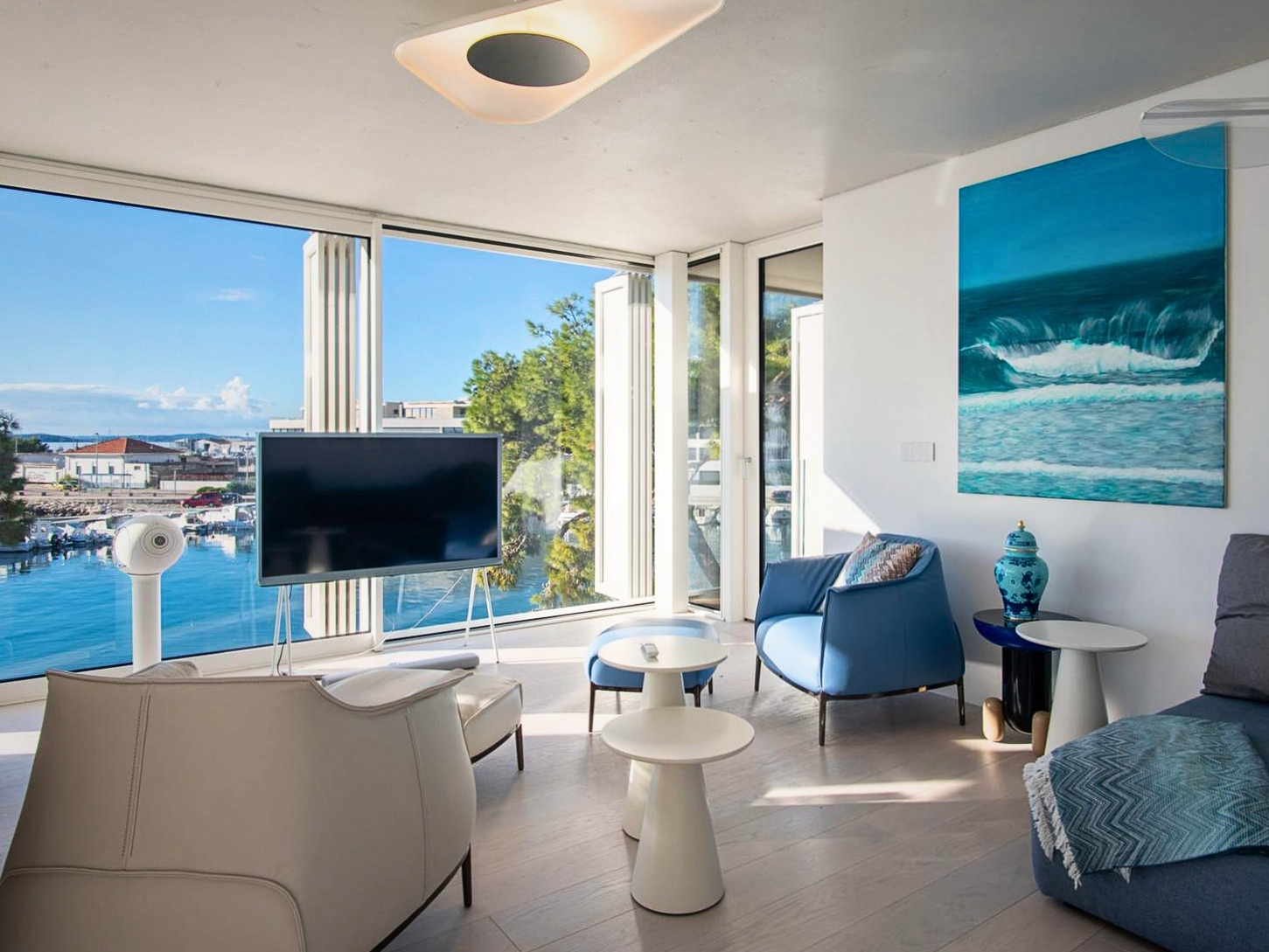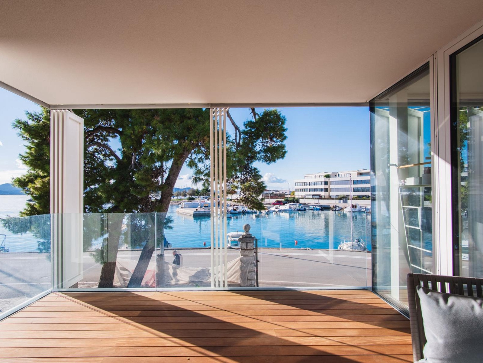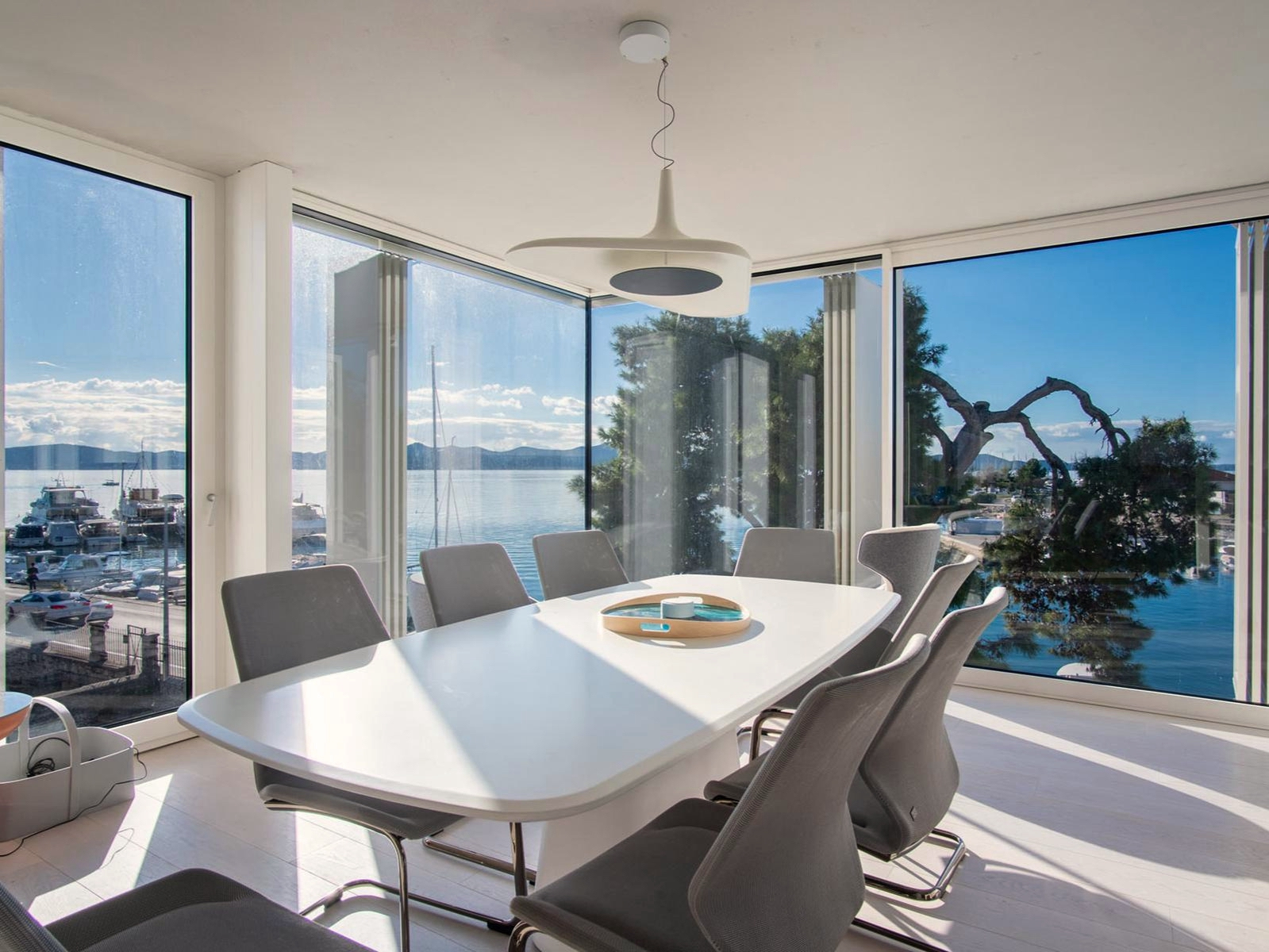 Defined by clean architectural lines and expansive glass surfaces, the property opens entirely towards the Adriatic, offering uninterrupted views of the city harbour and nearby islands.